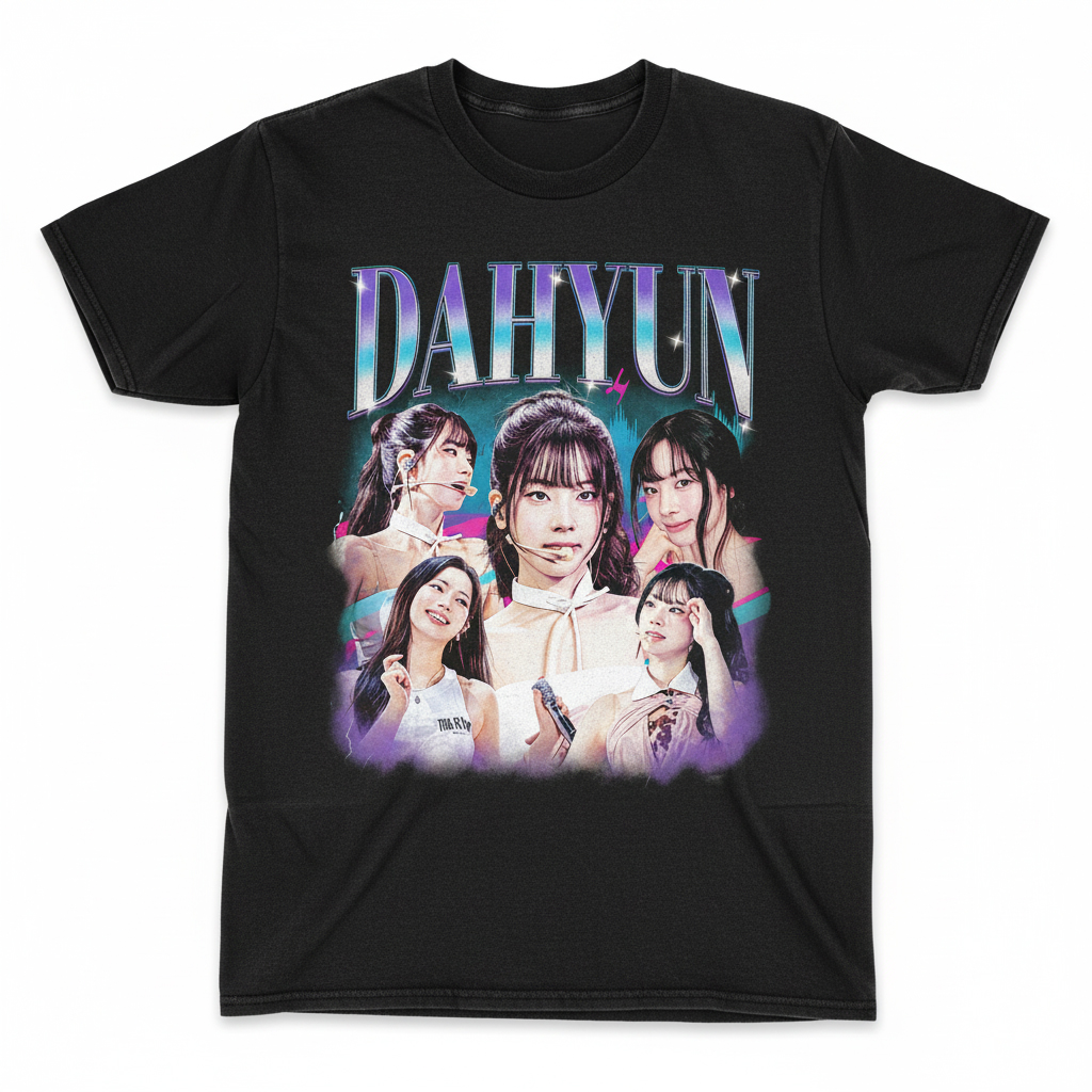 Embrace your inner ONCE with this exclusive Dahyun K-Pop Vintage Graphic Tee, a must-have for any dedicated fan of the iconic group TWICE. This premium black t-shirt features a striking retro-style collage of Dahyun, capturing her charismatic presence in a unique design reminiscent of classic 90s concert merchandise. Crafted for both comfort and style, this fan apparel allows you to proudly display your admiration for the ‘Dubu’ queen. The vibrant, yet subtly distressed graphic print ensures a timeless aesthetic that stands out whether you’re at a concert, a fan meet-up, or just enjoying a casual day out. Made from soft, breathable cotton, it offers all-day wearability and durability, making it an essential addition to your K-pop fashion collection. Celebrate your favorite idol and connect with the global TWICE fandom through this iconic piece of merchandise.