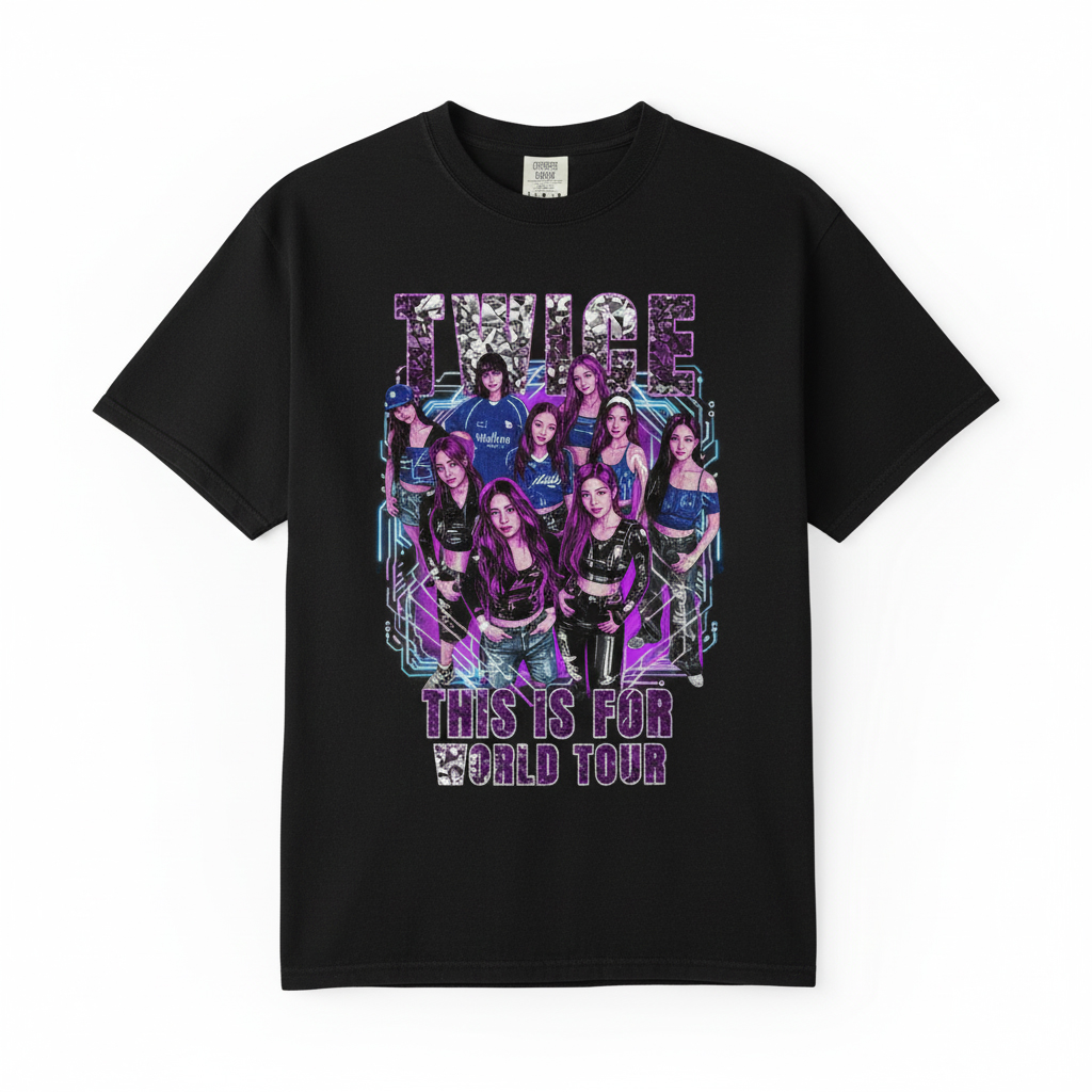 Immerse yourself in the vibrant world of K-Pop with the Official TWICE “This Is For World Tour” Graphic T-Shirt. This premium black tee features a striking, neon-infused design showcasing the beloved members of TWICE, set against a dynamic circuit board backdrop. Below the iconic group name, the phrase “THIS IS FOR WORLD TOUR” boldly declares your allegiance and celebrates their global journey. Crafted for both comfort and style, this fan apparel is ideal for attending live concerts, fan meet-ups, or simply expressing your passion for the JYP Entertainment sensation. The high-quality print ensures durability, making it a lasting memento of their incredible performances and a staple in any ONCE’s wardrobe. Pair it with jeans for a casual look or layer it under a jacket for a more edgy, concert-ready ensemble. This K-Pop merchandise is more than just clothing; it’s a statement of fandom, a connection to the music, and a celebration of the iconic girl group’s impact on the global music scene.
