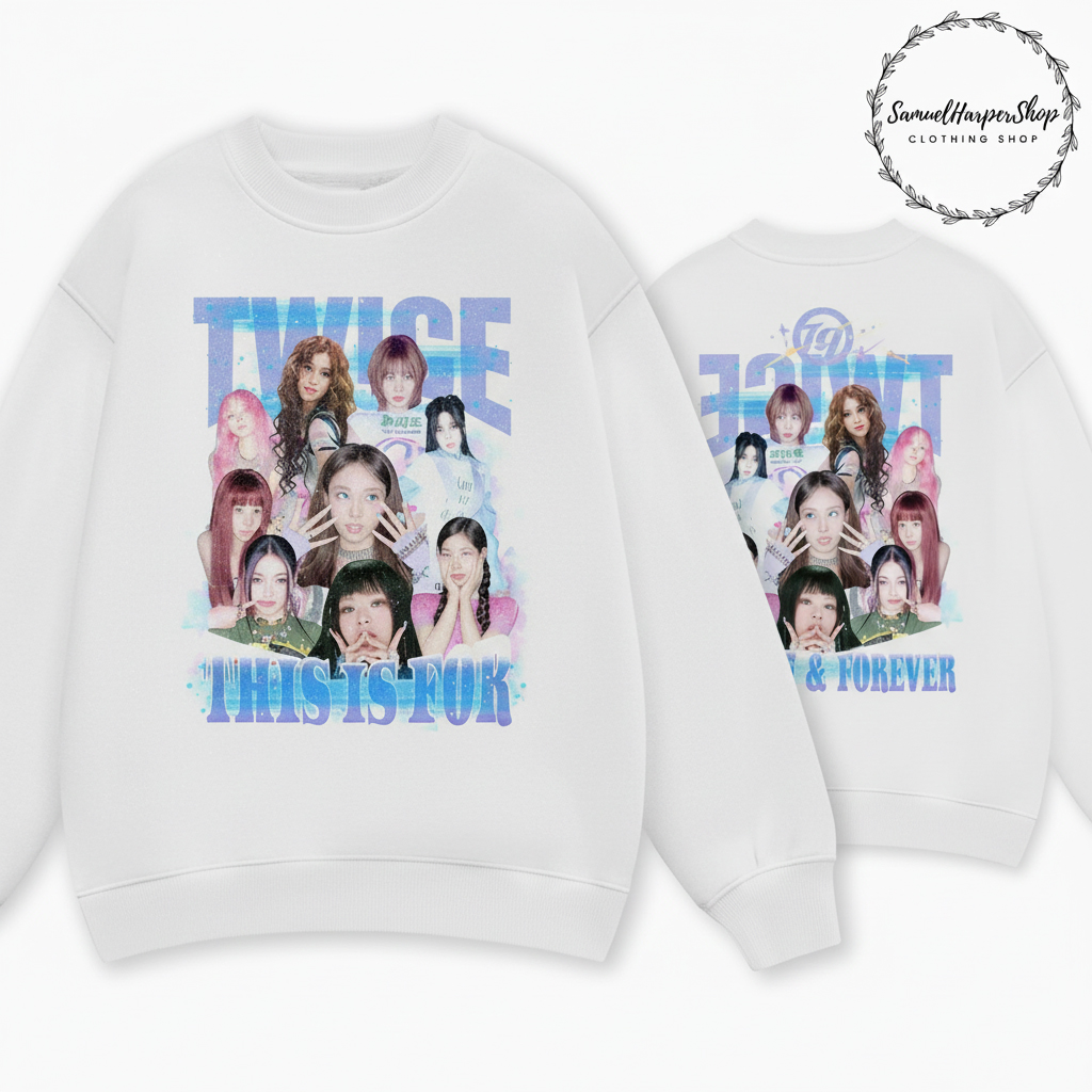 Dive into the world of K-Pop fashion with our premium TWICE K-Pop Group Graphic Crewneck Sweatshirt, designed for the ultimate ONCE. This vibrant pullover celebrates the iconic JYP Entertainment girl group, featuring a stunning collage of the members on both the front and back. The high-quality print captures the essence of TWICE’s dynamic energy, making it more than just apparel—it’s a statement of your fandom. Crafted from a soft, comfortable fabric blend, this sweatshirt ensures warmth and coziness whether you’re attending a concert, a fan meetup, or simply enjoying a casual day out. Its classic crewneck design offers a versatile fit that pairs effortlessly with any casual outfit, allowing you to express your love for your favorite idols in style. Embrace the spirit of Korean pop culture and wear your ONCE pride with this essential piece of TWICE fan merchandise.