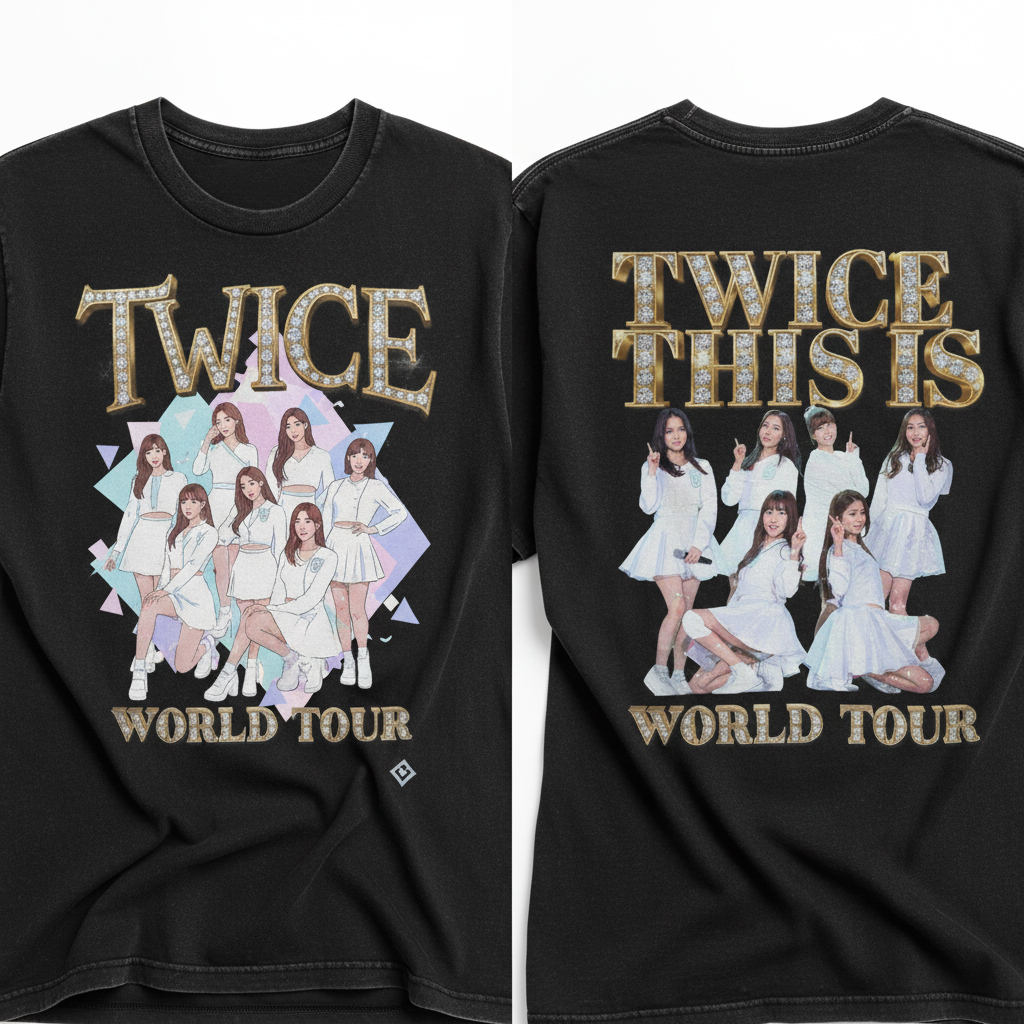 Dive into the world of K-Pop with the exclusive TWICE World Tour Graphic T-Shirt, a must-have for any dedicated ONCE. This premium vintage-washed black tee captures the vibrant energy of the global phenomenon, featuring stunning front and back designs. The front showcases an artistic illustration of the beloved TWICE members (Nayeon, Jeongyeon, Momo, Sana, Jihyo, Mina, Dahyun, Chaeyoung, Tzuyu) beneath dazzling “TWICE WORLD TOUR” lettering, evoking the excitement of their live performances. Flip it over to reveal a dynamic photo of the K-Pop idols themselves, accompanied by the bold “TWICE THIS IS WORLD TOUR” statement, making a powerful declaration of your fandom. Crafted for both comfort and style, this fan apparel is perfect for attending concerts, casual wear, or simply expressing your admiration for the South Korean girl group. The soft, durable fabric ensures a comfortable fit, while the unique distressed finish adds a touch of retro flair. Celebrate the music, the talent, and the unforgettable moments of TWICE’s journey with this iconic piece of K-Pop fashion.