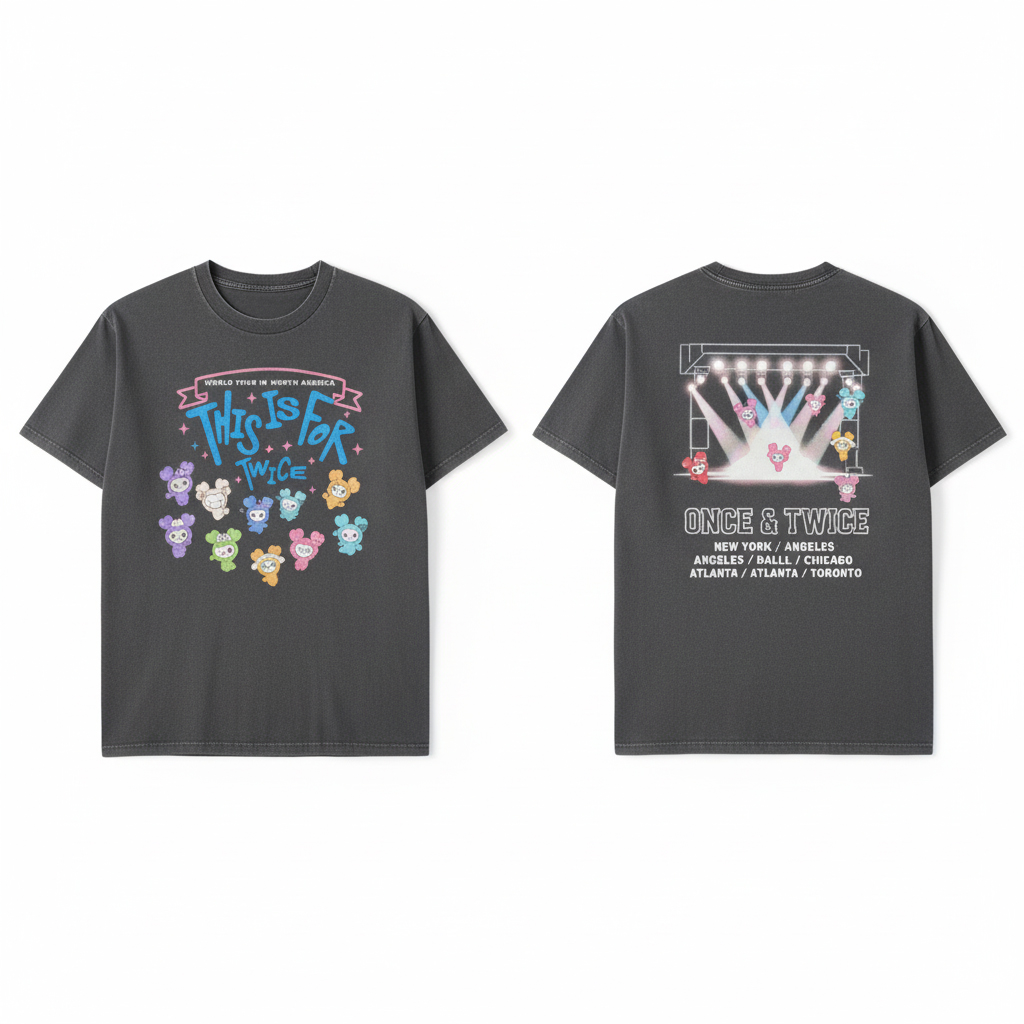 Immerse yourself in the vibrant world of K-Pop with the official TWICE World Tour North America T-Shirt. This unique piece of ONCE & TWICE concert merchandise is an essential addition for dedicated fans and collectors. Crafted from soft, high-quality washed black cotton, this graphic tee offers both supreme comfort and a stylish, slightly vintage aesthetic, making it perfect for everyday wear, attending future K-Pop events, or simply showcasing your fandom. The front proudly displays “WORLD TOUR IN NORTH AMERICA” and “THIS IS FOR TWICE” alongside a charming array of colorful TWICE Lovelys characters, capturing the playful and energetic spirit of the group. Turn heads with the captivating back design, featuring a dynamic stage setup with spotlights illuminating the iconic TWICE mascots, accompanied by the powerful “ONCE & TWICE” slogan and a comprehensive list of the North American tour cities: New York, Los Angeles, Dallas, Chicago, Atlanta, and Toronto. This fan apparel is more than just a shirt; it’s a cherished souvenir, a bold statement of fandom, and a tangible way to relive the unforgettable moments of the TWICE concert experience. Celebrate your deep connection to the global phenomenon that is TWICE and join the ONCE fandom in ultimate style.
