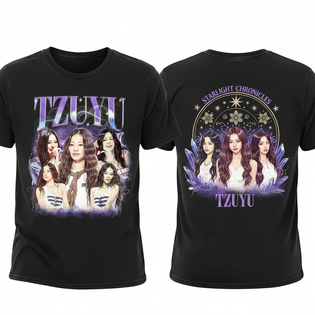 Immerse yourself in the world of K-pop fashion with our exclusive Vintage Jeongyeon Graphic Tee. This meticulously designed fan apparel pays homage to the beloved TWICE member, Jeongyeon, featuring a captivating front print with multiple iconic images of the idol, framed by intricate purple floral and ornamental motifs. The washed black cotton fabric provides a comfortable, lived-in feel, reminiscent of classic retro band tees. On the reverse, a striking “JY” monogram is elegantly integrated with a swirling, artistic design in complementary purple and teal hues, ensuring a distinctive look from every angle. This premium K-pop shirt is more than just clothing; it’s a statement of fandom and style. Ideal for concert wear, casual outings, or simply expressing your admiration for Jeongyeon and TWICE, it blends comfort with iconic design. Celebrate your favorite idol with this collectible piece of K-pop merchandise, crafted for true ONCE.